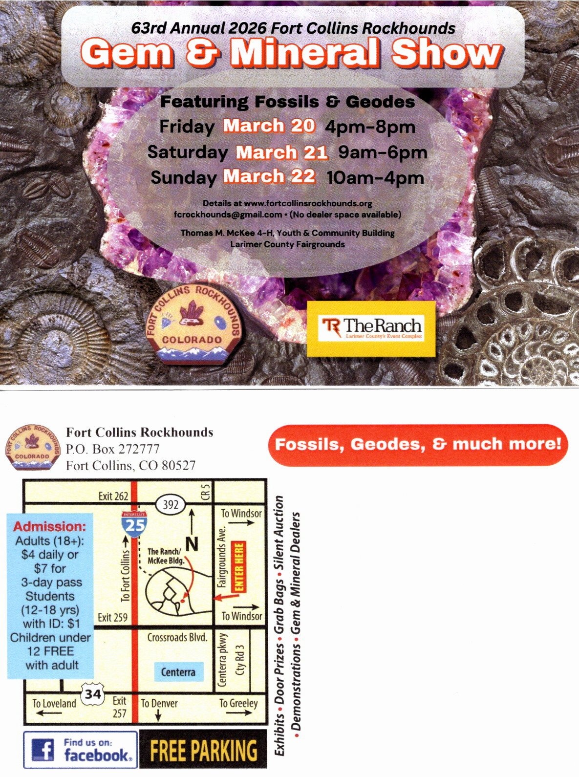 The Fort Collins Rockhounds Club presents the 63rd Annual 2026 Gem and Mineral Show